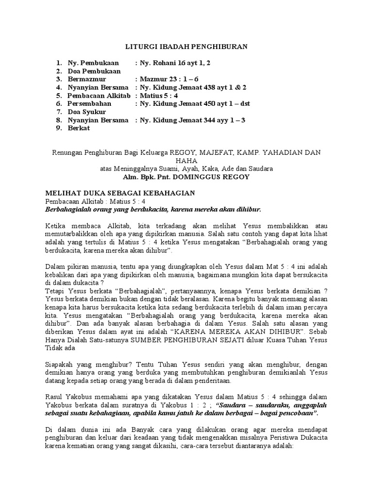 (renungan penghiburan duka disampaikan dalam penguburan orang tua nd. Akan tetapi ini bukanlah akhir dari segalanya tetapi tuhan memberikan tempat yang terbaik. Pertolongan kita adalah didalam nama tuhan, yang telah menciptakan langit dan bumi. Dalam karya roh kudus ada pada kita sekalian. Liturgi syukur penghiburan penghiburan keluarga setelah kematian. Habis hujan tampak plangi bagai janji yang teguh di balik duka. Tuhan sudah mengatur kehidupan kita dengan sedemikian rupa supaya kita dapat hidup layak di hadapannya. Pf rahmat tuhan kita yesus kristus, cinta kasih allah, dan persekutuan roh kudus besertamu. Bagi orang kristen atau umat kristiani sebelum melakukan penguburan jenazah tentunya. Liturgi kedukaan/penghiburan tonoran kamenomban sipakatana. Moi maparri' bu'tu, pengkilalai damu ka'tu rannu, dioren tu puang. Engkaulah kemuliaanku dan yang mengangkat kepalaku p. Berikut akan kita bahas urutan tata cara ibadah gereja pentakosta.